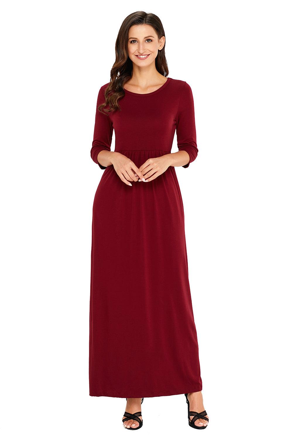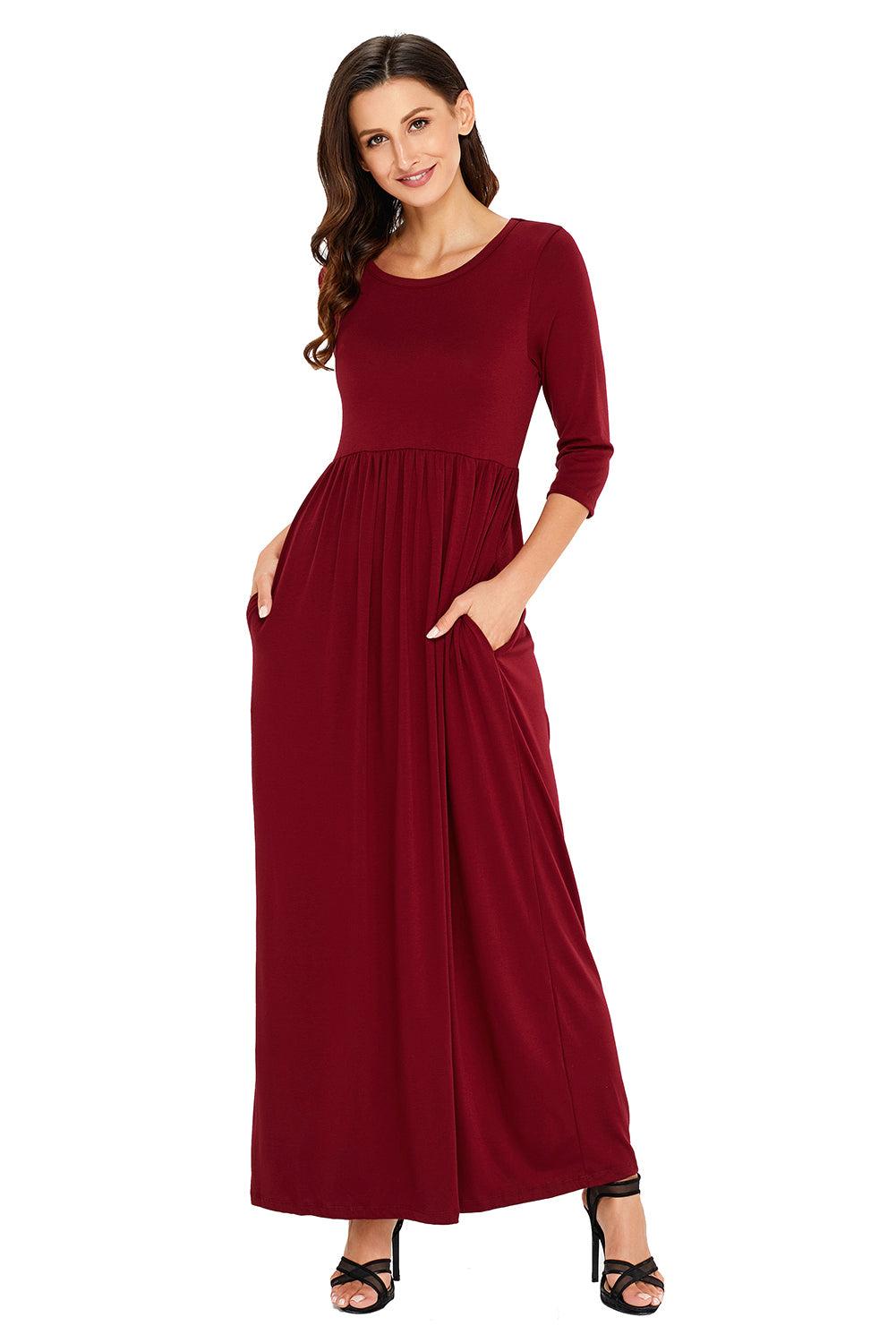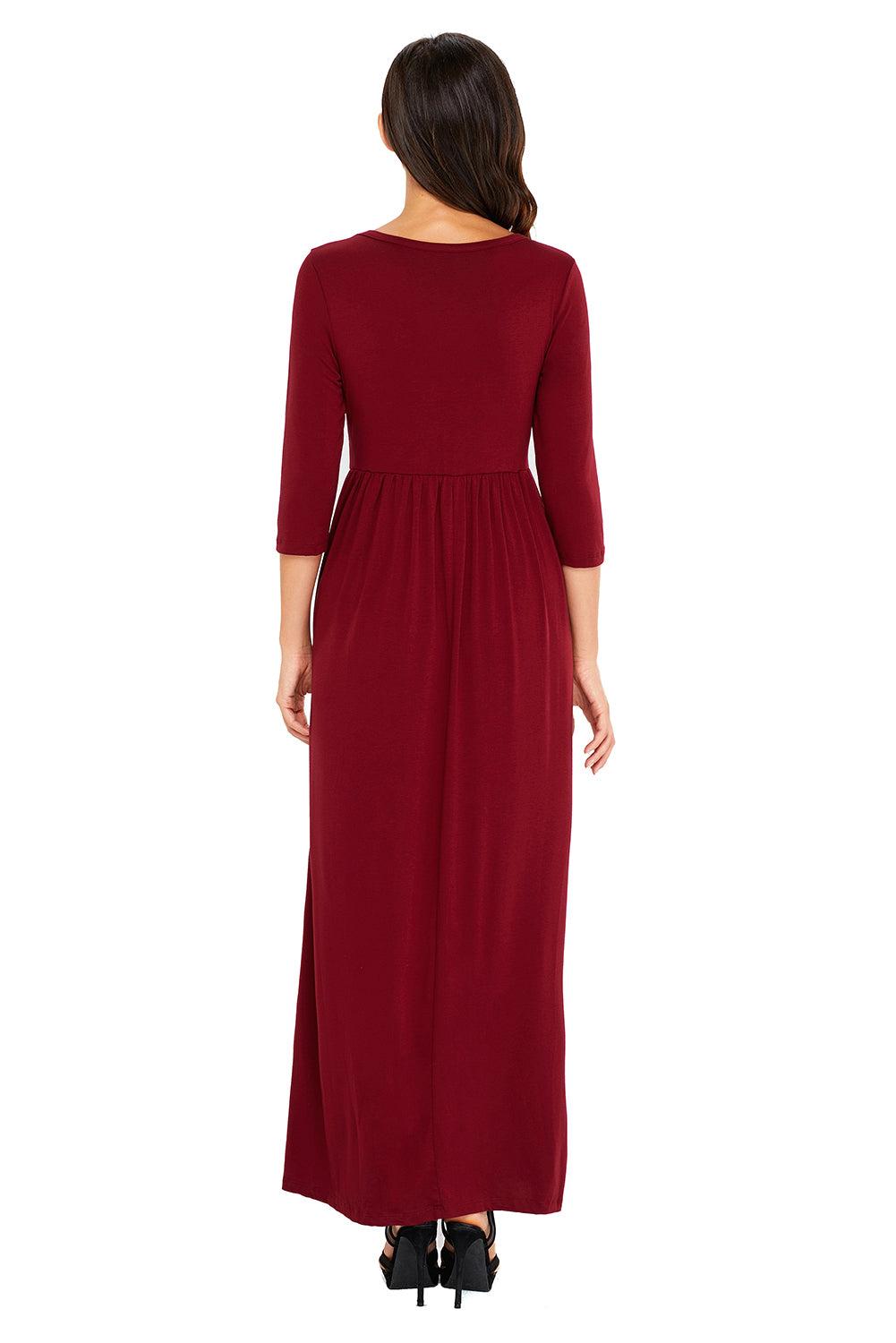 Burgundy Pocket Design 3/4 Sleeves Maxi Dress