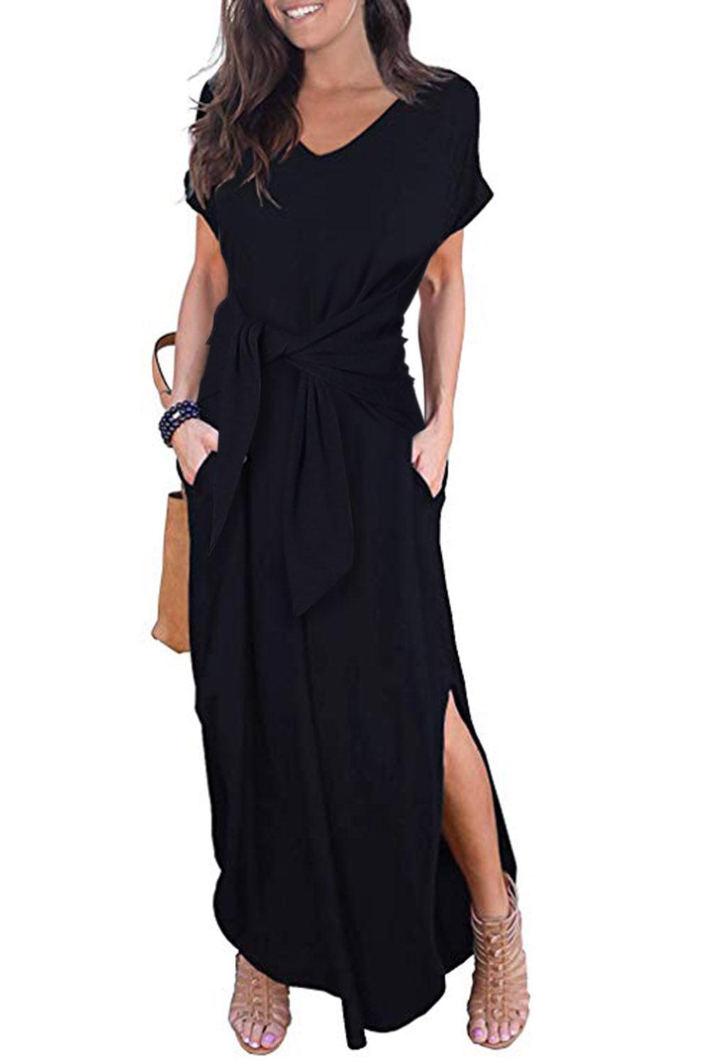 Casual Loose Pocket Short Sleeve Split Maxi Dress