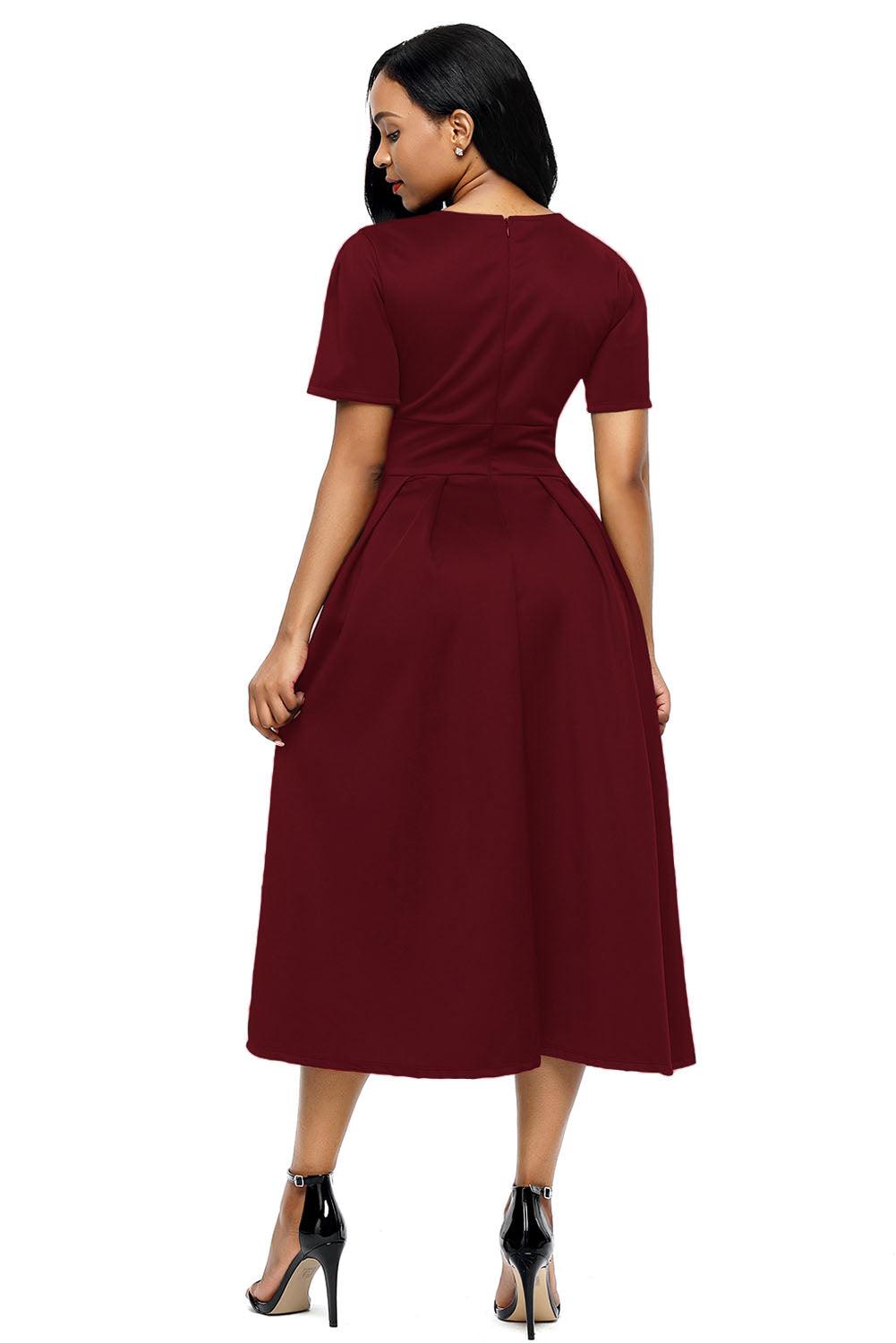 Claret Split Neck Short Sleeve Midi Dress with Bowknots