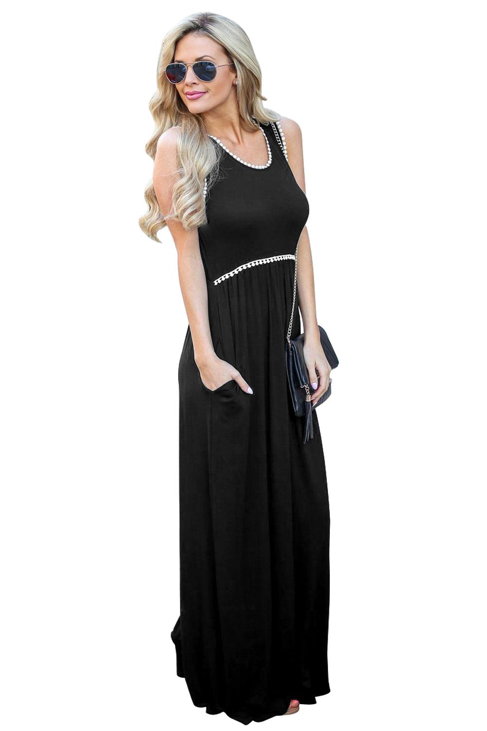 Crochet Pompom Trim Black Sleeveless Maxi Dress