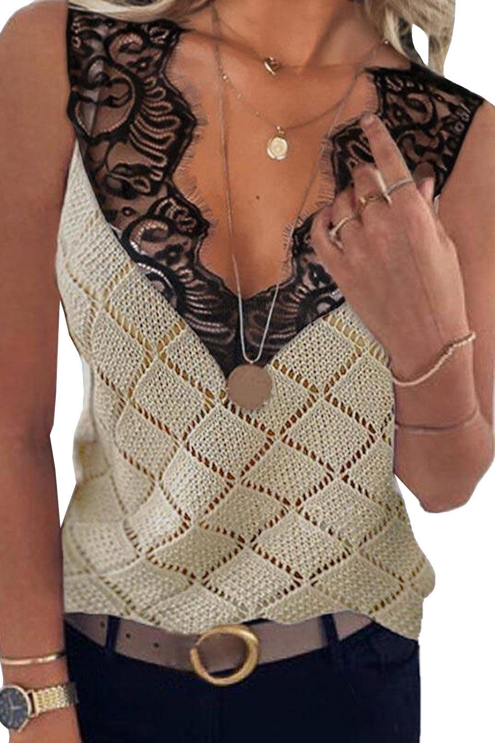 â¢It featured with sleeveless, unique knit, lace trim and v neck