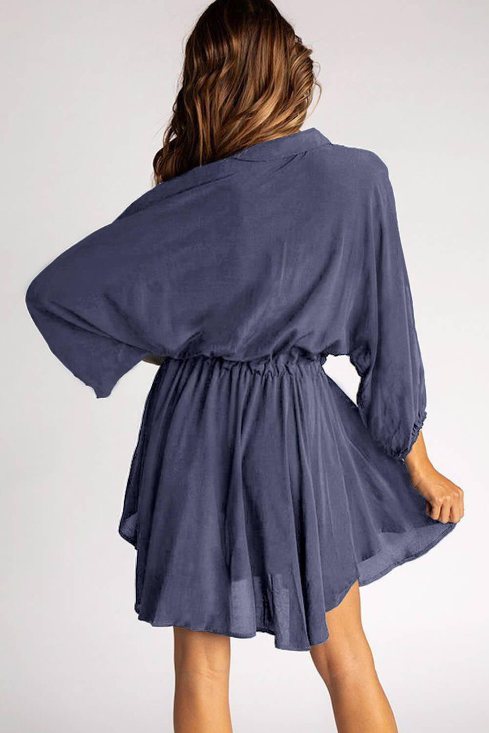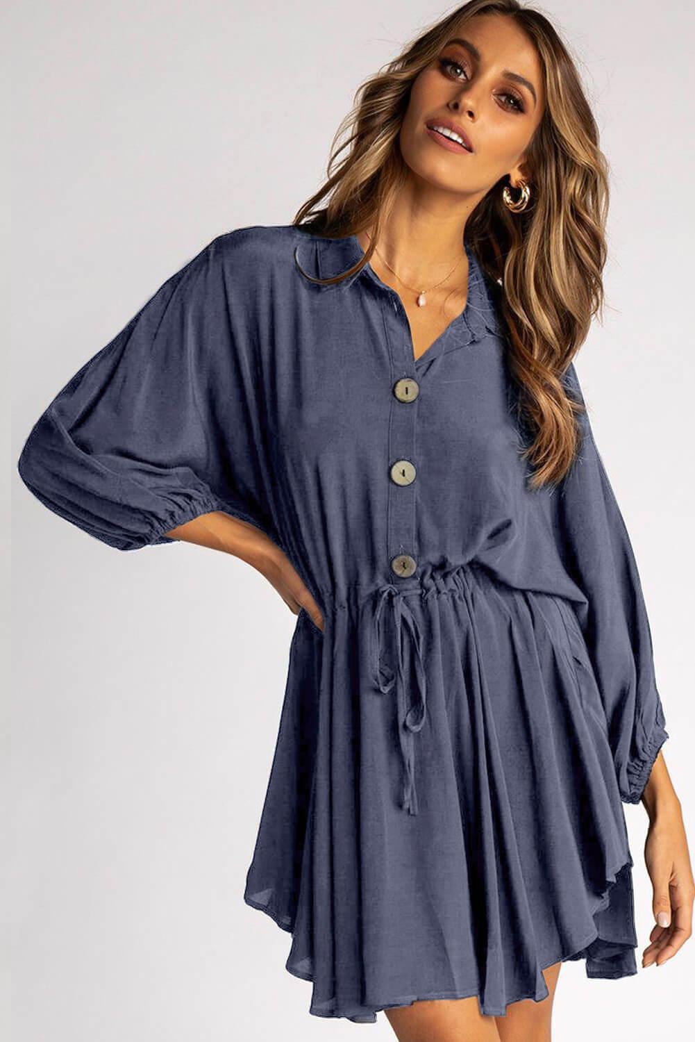 â¢Collared neckline, loose fitting, mini-length cut